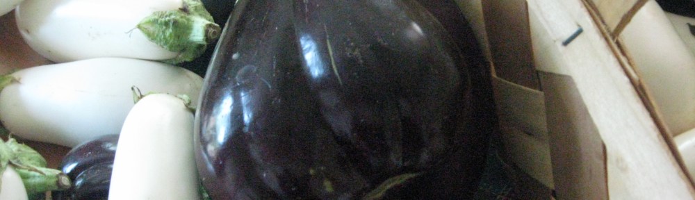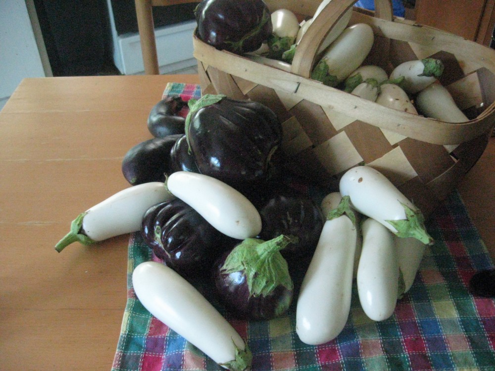 For any of you who might want to think about growing your own next summer, keep in mind that it’s a hot-weather plant. The nighttime temperatures need to be about 55 ° F before you put the plants out in the garden; otherwise they just kind of sit there and never do anything–even after the temperatures warm up. So don’t rush it–wait until it’s warm enough. Then you’ll have a plant that is very productive (if you keep harvesting the fruits). Come peak season, you’ll find eggplant a bit like zucchini…you will have an abundant (maybe even excessive) supply of this lovely stuff. Maybe you neighbors would like some…especially if you can tell them some things to do with it when you give it to them.