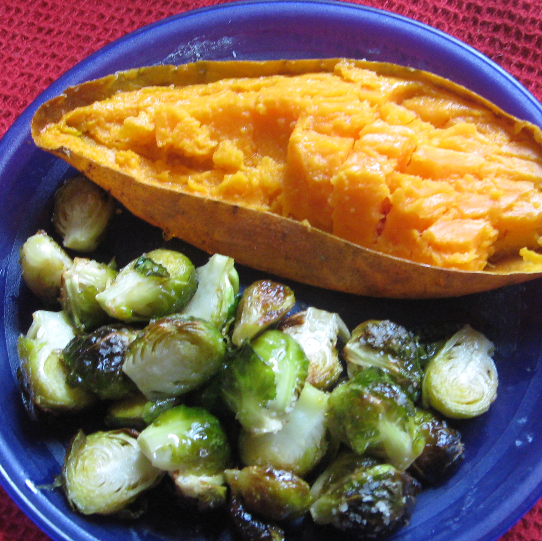 Since it was about lunch time, I was preheating the oven to bake a sweet potato (a very large sweet potato so that I’ll have some for another use as well). I read the recipe and grabbed the last of the Brussels sprouts from the fridge. I didn’t have the full amount, but this is a recipe that does not depend on the quantity–which is great for us solo cooks. Since I was baking my potato in a 350 ° F oven, I did alter the cooking time just a bit–I popped the Brussels sprouts prepared as in the recipe into the oven for about 45 minutes right along side my sweet