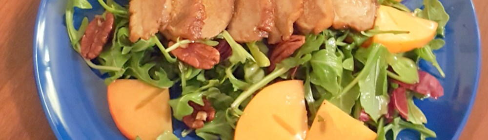 I made a vinaigrette using about 2:1 proportions of oil and sauce, tossed the greens, persimmon, and some pecans with it; making a perfect bed for the sliced duck breast that was quickly warmed in a skillet. The finishing touch was just a bit more chipotle oil–just a few drops–on the sliced duck breast.