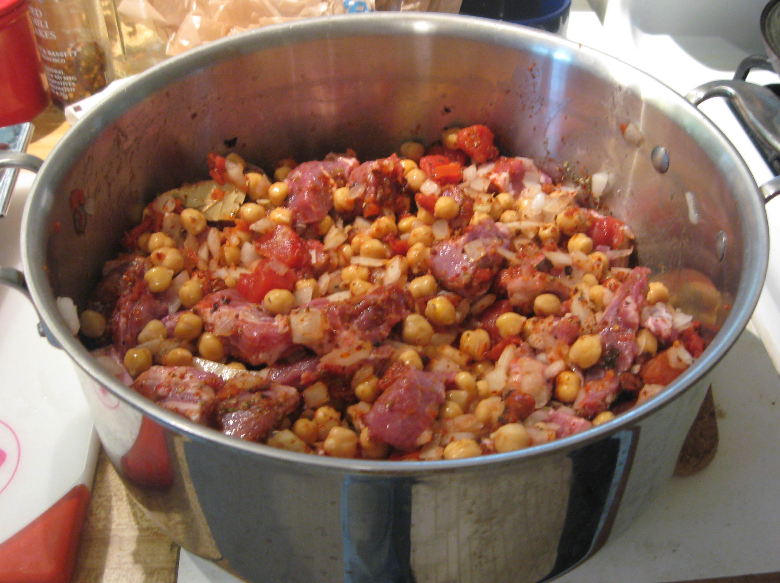 It’s another grey day–unseasonably warm, but at least not hot, sticky, and terribly humid today–the kind of day when you need to smell something cooking–long, slow, and tantalizing.   I found lamb shoulder chops on special (2-1/2-pound package) at the grocery store, I decided to try the lamb/garbanzo slow-cooker thing in the oven since it’s not too hot (and I’ll use the oven to prepare a second dish for reheating tomorrow (acorn squash stuffed with Sicilian sausage).