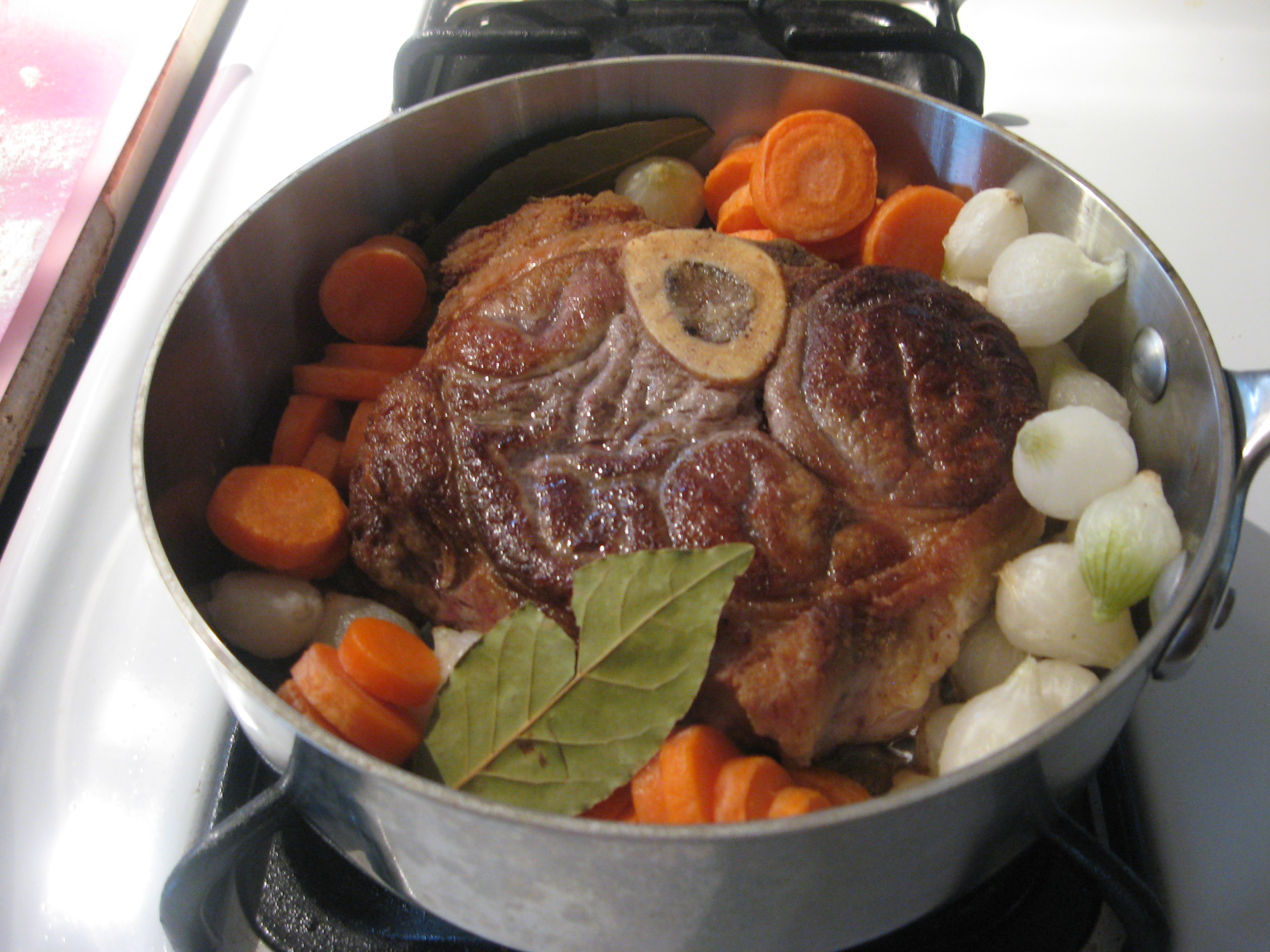 Once the shank was nicely browned, there not really much to do except tuck some carrots, onions, and bay leaves around IMG_8056the edges, a pinch of salt,  add some dry white wine, and some beef stock–just poured it in until it was about 1/3 of the way up the side of the meat. That’s the reason it’s important to have an appropriate size pot–too large and you have to add too much liquid.  We’re not wanting to make soup here.