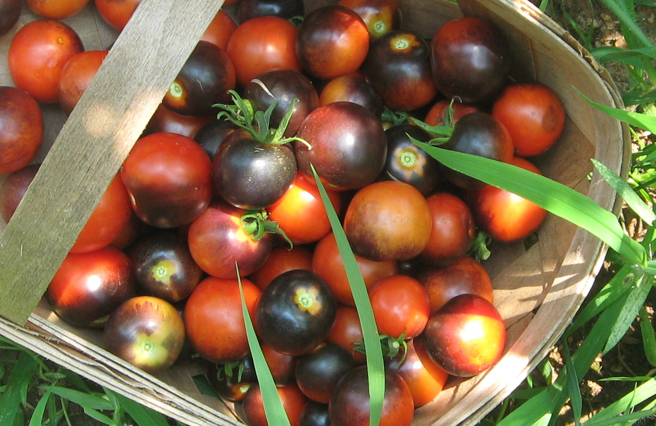 When you’re just getting thoroughly tired of winter–about late November or  very early January–the seed catalogs start to appear in the mail box.  You spend hours happily looking through them and anticipating planting seed.  There are all those gorgeous pictures and the descriptions.  For me this is especially a problem with tomatoes.  So, every year I end up wanting something new–in addition to those heirlooms that I always want (Black Krim, Cherokee Purple). Last year my new addition was a Japanese Black Trifle.  It’s now become one of the regulars, and is close to replacing the Black Krim because it tastes wonderful and produces more tomatoes.