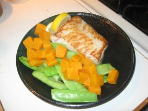 I warmed my plate under hot water and dried it, and put my dinner on it!  Simple, and really pretty healthy–I did put just a small pat of butter on top of the fish to finish it off with the lemon.  That was about 30 to 40 minutes start to finish.  Since this was my first time with this fish, I wanted to cook it as simply as possible to get to know its basic taste.  It was a very mild fish, but it held together well during the grilling.  It’s going in my “standby” category with tilapia for a good all-purpose white fish.  (It’s line-caught, by the way; I was pleased to see that HT signs indicated how all of the fish in the case had been caught)!   It was a simple, but good, quick, healthy meal!