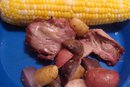 Mojitos started us off; then we had a very eclectic meal–one of the guests prepared Padrón peppers for starters–I’d never tasted them before, but I certainly hope that it will not be the last time.  Those wereplate with lamb corn on the cob and potatoes followed by wonderful gazpacho, then by crab cakes, with some melon interspersed.  Then,  the main course:  lamb shanks, corn on the cob, and several kinds of newly dug potatoes steamed and then tossed with extra-virgin olive oil, salt and peppers.  There were Purple Majesty, Red Thumb, and Russian banana potatoes mixed.  (Unfortunately, the Red Thumbs lost their pink color during the steaming, but there were the lovely red skins to make it red, white(ish), and blue!)