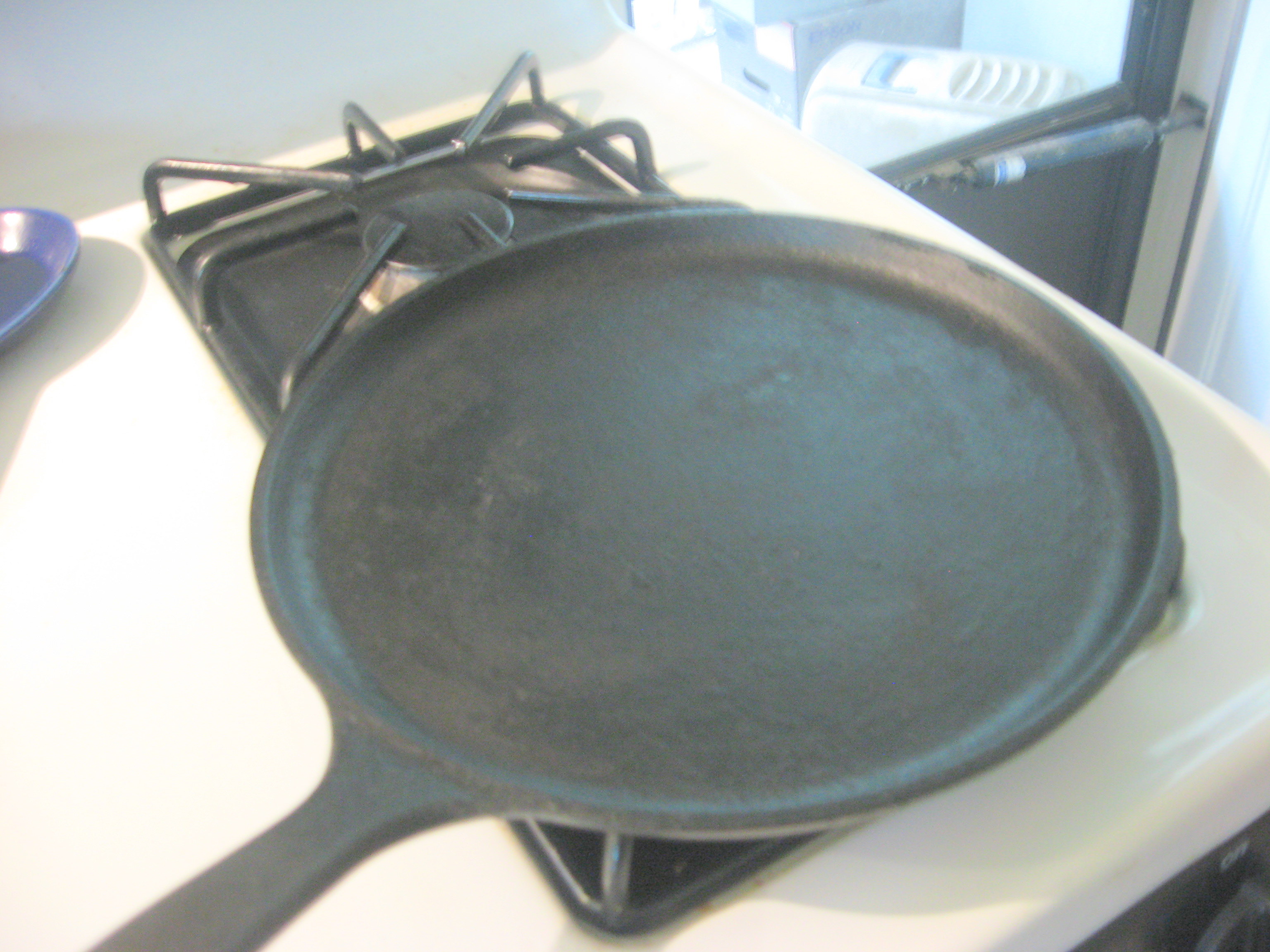 • Heat cast-iron griddle (or skillet) over high heat until it’s very hot–you want really high heat. This is why you deactivated the smoke alarm. Test heat by flicking a drop of water onto the griddle–it will sizzle and skitter around hectically, kind of like one of the really supper bouncy balls that my cat plays